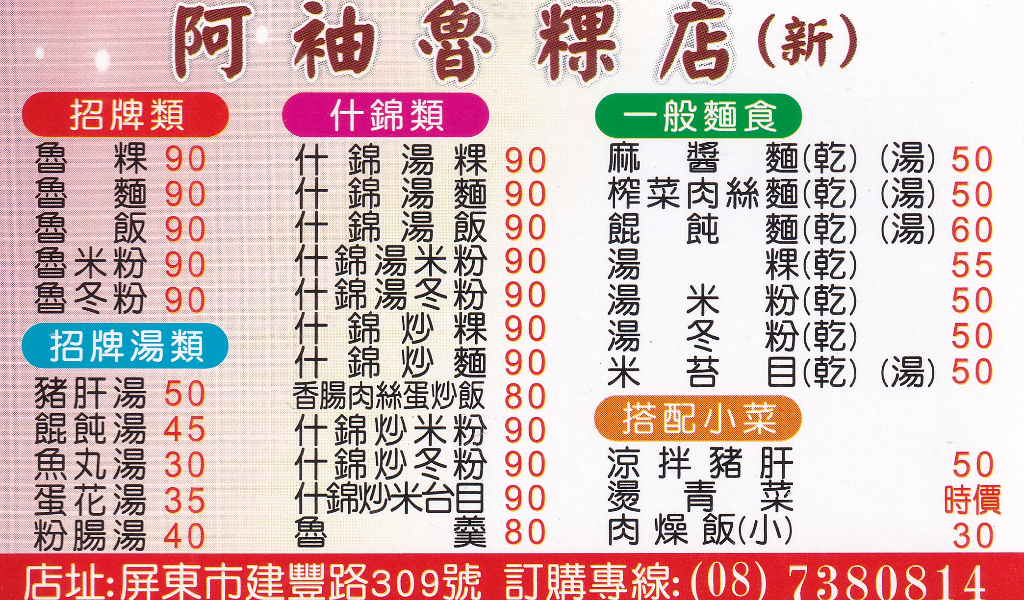 位於屏東市建豐路與豐榮街交叉口的阿袖魯粿店,是九如有名氣的傳統小吃魯粿仔,酸甜口味、不油膩,雖然在大熱天喝著熱湯,但粿仔條還是讓人覺得清爽入口,幾乎每一、二星期就會外帶回家享用,小菜也都不錯吃,就是不好停車,建議騎機車。阿袖魯粿店名片&菜單 - 9月 20 週六 202516:22